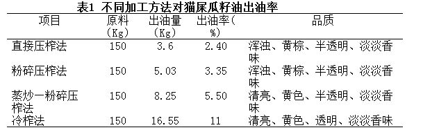 不同加工方法對貓屎瓜籽油出油率的影響