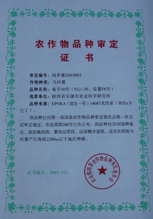 秦芋30號(922-30、安薯58號)。系安康市農(nóng)科所利用馬鈴薯品種EPOKA(波友一號)作母本,4081無性系(米拉×卡丁它)作父本雜交實生苗株系選育而成,原代號922-30.2001年9月通過陜西省農(nóng)作物品種審定委員會審定,定名為安薯58號。2003年2月8日經(jīng)第一屆國家農(nóng)作物品種審定委員會第一次會議審定通過,農(nóng)業(yè)部第248號公告公布,定名為秦芋30號,審定編號:國審薯2003002.2003年9月國家科技部、農(nóng)業(yè)部公布為《優(yōu)質(zhì)專用農(nóng)作物新品種》之列,并納入國家“863”計劃管理。