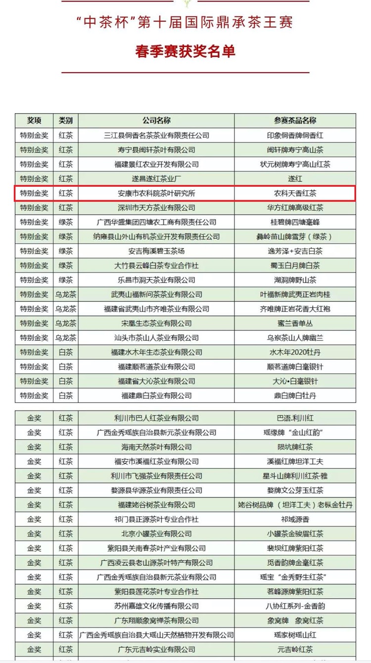經(jīng)過長達(dá)3個多月的征集、審評,“中茶杯”第十屆國際鼎承茶王賽春季賽“茶王”正式誕生,安康市農(nóng)業(yè)科學(xué)研究院研制選送的農(nóng)科天香紅茶獲特別金獎殊榮,這是安康市農(nóng)科院第一次選送茶樣參賽,也是陜西省唯一一個獲得該獎項單位。