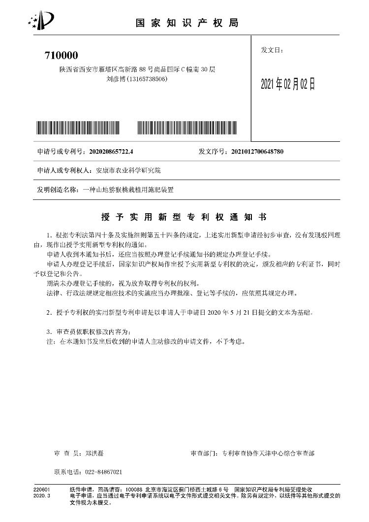 近日,我院果蔬所申報(bào)的一項(xiàng)“一種山地獼猴桃栽植用施肥裝置”實(shí)用新型專利成果獲得國(guó)家知識(shí)產(chǎn)權(quán)局授權(quán),專利號(hào)為202020865722.4,專利權(quán)人為安康市農(nóng)業(yè)科學(xué)研究院。