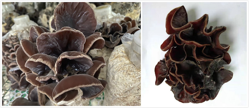 “安耳1號”新菌株是通過采集野生毛木耳子實(shí)體,經(jīng)分離、純化、新菌株觀察試驗(yàn)和栽培馴化選育出的毛木耳新菌株。在PDA培養(yǎng)基中,菌絲呈白色,氣生菌絲少,菌落背面色素不明顯;新鮮子實(shí)體膠質(zhì),耳狀或盤狀,耳片幼時(shí)邊緣弧形,成熟后邊緣波浪形;鮮耳腹面紅褐色,背面灰黃色,有短絨毛;干耳腹面黑褐色,背面灰黃色;耳片平整、抗逆性強(qiáng)、商品性狀好。該菌株生育期50-60d,菌絲生長溫度為15-25℃,出耳溫度為15-30℃。