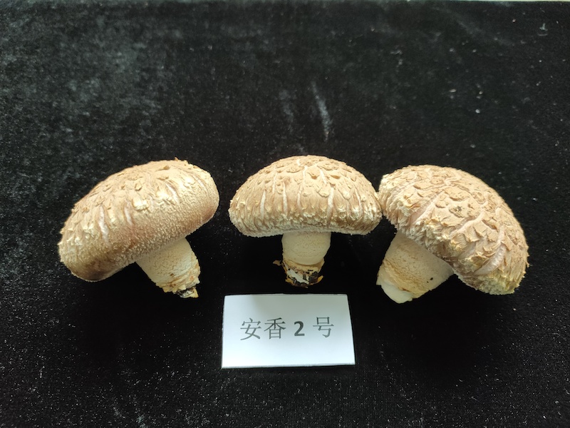 “安香2號”屬于中溫菌,菌齡100-120d,菌絲潔白粗壯、耐高溫能力、抗雜能力強(qiáng)。子實體散生,菌蓋顏色白、直徑5cm以上;菌肉致密、菌蓋厚,菌蓋縱切面頂端呈凸形;菌柄短、纖毛致密、主要分布在菌柄的末端;鱗片呈白色,分布在菌蓋四周;菇型圓整,大中菇比例高。