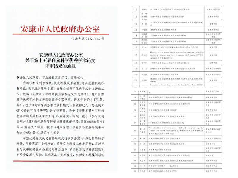 2021年,發(fā)表學術論文9篇,參加安康市第十五屆自然科學優(yōu)秀學術論文評選,獲獎13