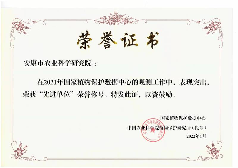 日前,國家植物保護(hù)數(shù)據(jù)中心對(duì)全國2021年度國家植物保護(hù)數(shù)據(jù)觀測(cè)工作進(jìn)行考核,市農(nóng)科院被授予“2021國家植物保護(hù)數(shù)據(jù)中心觀測(cè)工作先進(jìn)單位先進(jìn)單位”稱號(hào),我院負(fù)責(zé)植物保護(hù)監(jiān)測(cè)工作的蒲正斌、謝世學(xué)、覃劍鋒3名同志被授予“國家植物保護(hù)數(shù)據(jù)中心觀測(cè)工作工作先進(jìn)個(gè)人”。