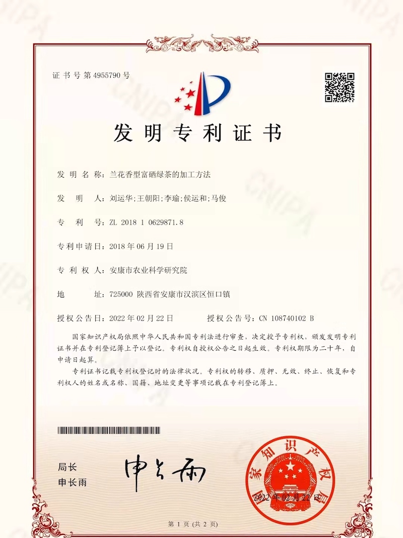 近日,我院茶葉研究所申請的發(fā)明專利《蘭花香型富硒綠茶的加工方法》獲得了國家知識產(chǎn)權局授權,專利號為ZL201810629871.8。此項發(fā)明提供了一種蘭花香型富硒綠茶的加工方法,該方法以紫陽群體種夏秋茶鮮葉作為原料,優(yōu)化采茶標準,將紫陽茶傳統(tǒng)工藝與現(xiàn)代制茶技術相結合,改進殺青、烘焙、提香等加工工藝,成功研制出了蘭花香型富硒綠茶,提高了夏秋茶的綜合利用率。