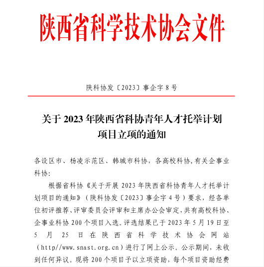 市農(nóng)科院2人入選2023年陜西省科協(xié)青年人才托舉計(jì)劃項(xiàng)目