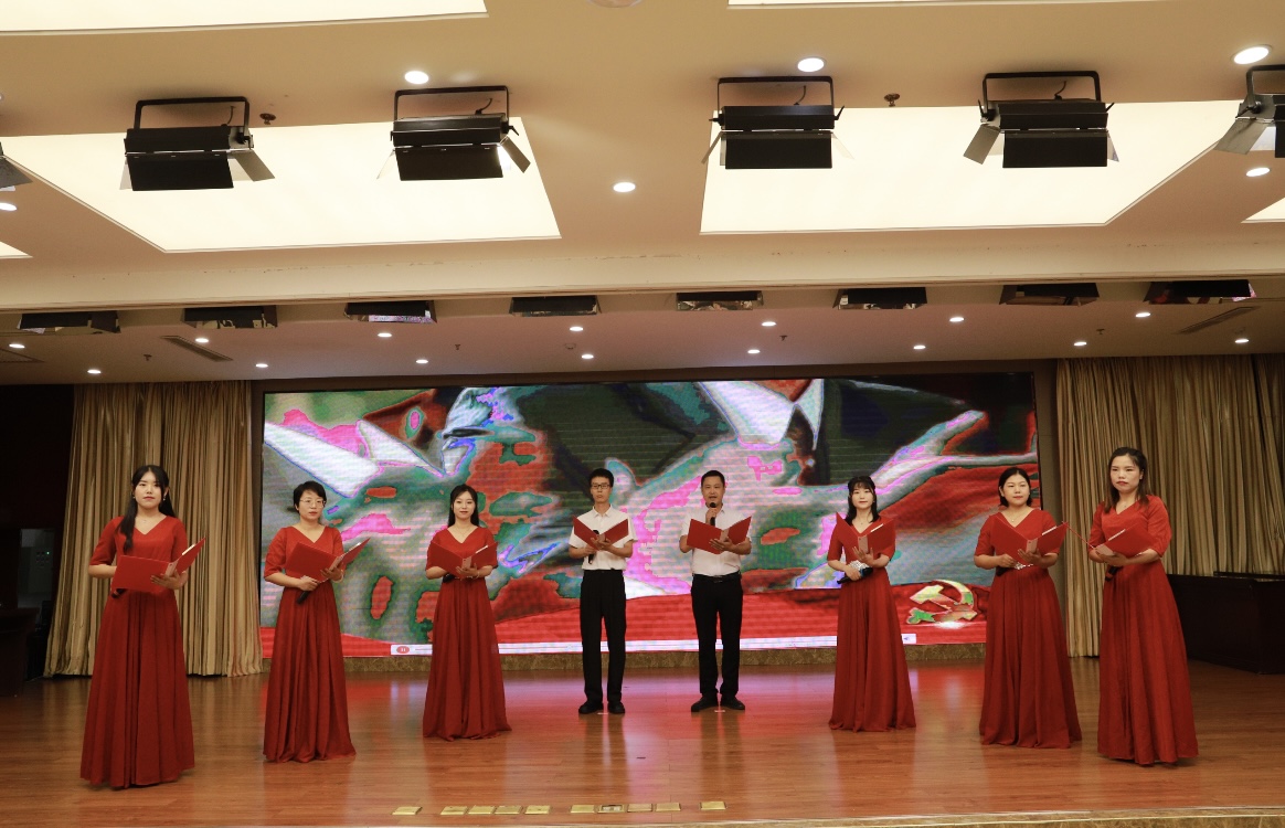 活動(dòng)在莊嚴(yán)的國(guó)歌聲中拉開序幕。由我院精心準(zhǔn)備,青年黨員自編自排、自導(dǎo)自演的朗誦節(jié)目《崢嶸百年風(fēng)雨路 同心向黨稼穡行》伴隨著激昂雄渾的音樂在會(huì)場(chǎng)傾情上演,8名農(nóng)科人用激情澎湃的聲音表達(dá)著對(duì)黨的敬愛、對(duì)工作的熱愛,彰顯農(nóng)科人愛黨愛國(guó)之情、敬業(yè)愛崗之心,展現(xiàn)農(nóng)科人員多才多藝、團(tuán)結(jié)拼搏、攜手奮進(jìn)的精神風(fēng)貌。朗誦聲中,黨員干部們一同品味激情燃燒的紅色歲月,回顧中國(guó)人民從站起來到富起來、再到強(qiáng)起來的偉大飛躍歷程,感受中國(guó)人由吃不飽到吃得好,從傳統(tǒng)種植到多元化發(fā)展的歷史性變革,奮進(jìn)、激昂的旋律使黨員干部從中汲取了奮進(jìn)的力量、勇氣和情操,進(jìn)一步堅(jiān)定了永遠(yuǎn)聽黨話、跟黨走的理想信念。