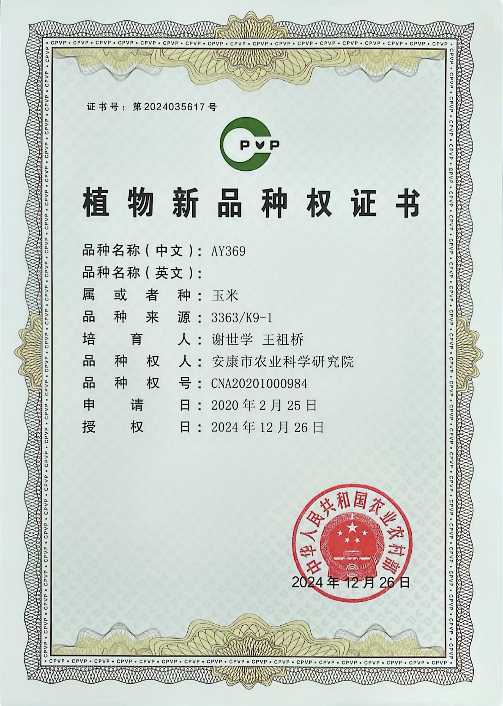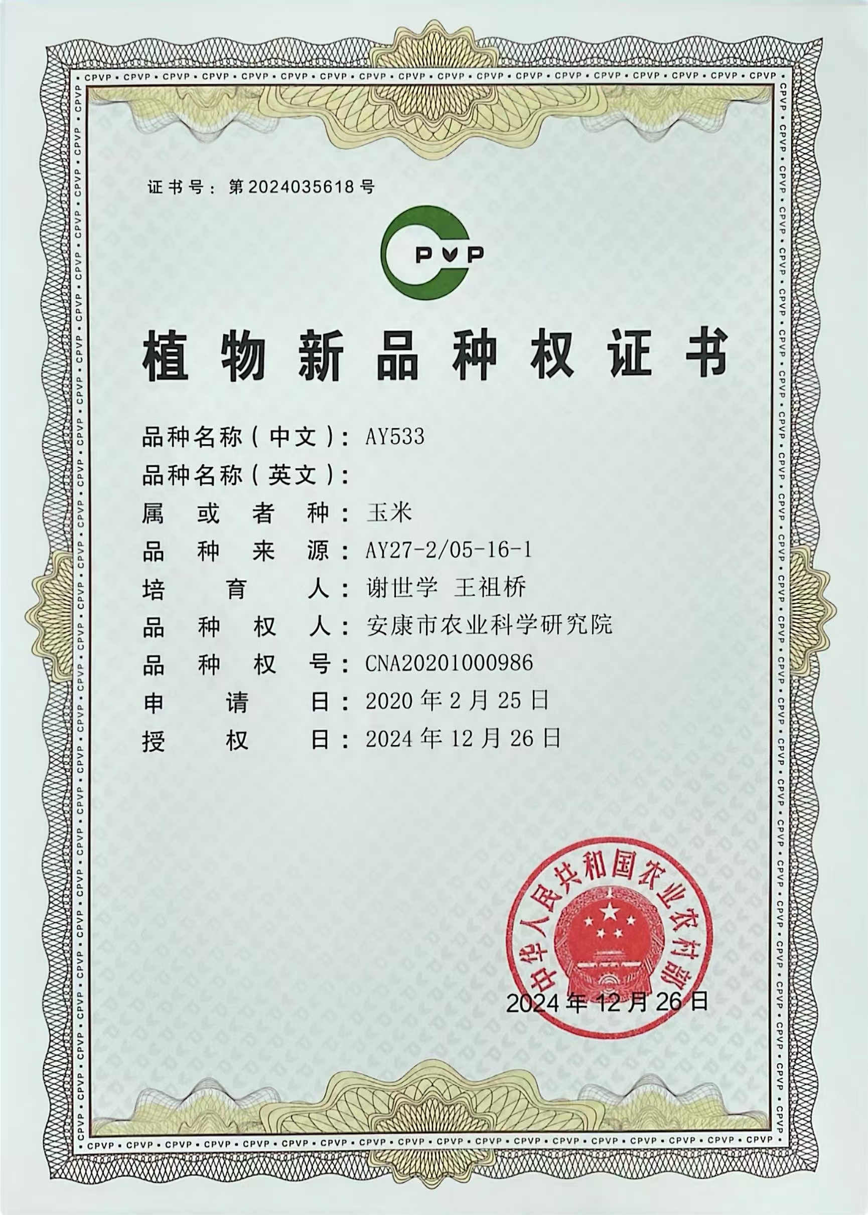 安康市農(nóng)業(yè)科學(xué)研究院魔芋種芋智能化繁育中心建設(shè)項(xiàng)目競(jìng)爭(zhēng)性磋商...由安康市農(nóng)科院高級(jí)農(nóng)藝師謝世學(xué)團(tuán)隊(duì)歷經(jīng)多年選育的玉米自交系“AY369”“AY533”經(jīng)過植物新品種測(cè)試審查,符合新穎性、特異性、一致性和穩(wěn)定性要求,獲得農(nóng)業(yè)農(nóng)村部授予植物新品種權(quán)。