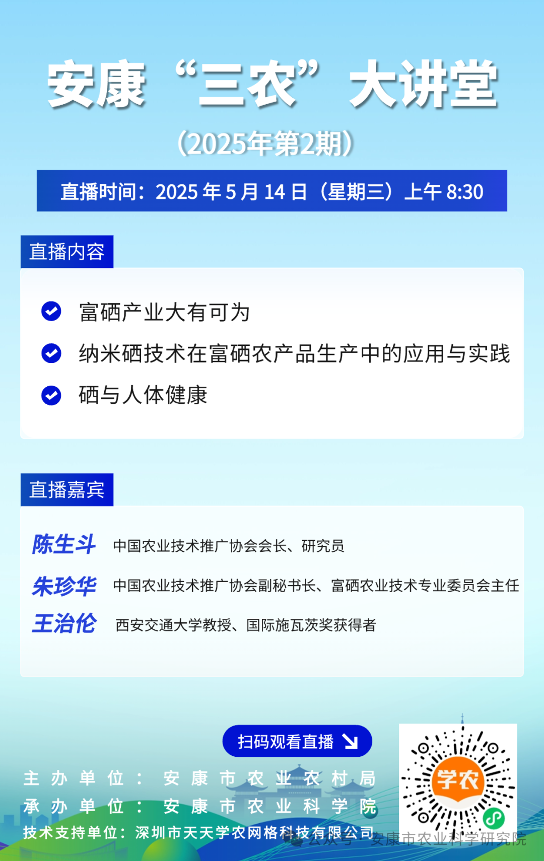 為推動富硒產(chǎn)業(yè)高質(zhì)量發(fā)展,提升農(nóng)技人員服務能力與專業(yè)水平,中共安康市委農(nóng)村工作領導小組辦公室、安康市農(nóng)業(yè)農(nóng)村局決定舉辦第二期三農(nóng)大講堂。本次大講堂將聚焦富硒產(chǎn)業(yè)發(fā)展實際需求,邀請中國農(nóng)業(yè)技術推廣協(xié)會、西安交通大學著名專家教授,圍繞富硒產(chǎn)業(yè)發(fā)展與應用開展專題授課,助力特色產(chǎn)業(yè)提質(zhì)增效,賦能鄉(xiāng)村振興?,F(xiàn)將有關事項通知如下: