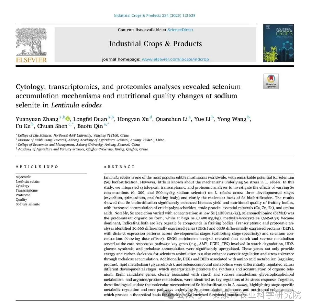 近日,安康市農(nóng)科院食用菌研究所科研團(tuán)隊(duì)聯(lián)合西北農(nóng)林科技大學(xué)秦寶福副教授、安康學(xué)院沈川副教授,在國(guó)際學(xué)術(shù)期刊Industrial Crops Products(中科院一區(qū)TOP,IF=6.2)發(fā)表重要研究成果。該研究借助細(xì)胞學(xué)、轉(zhuǎn)錄組學(xué)和蛋白質(zhì)組學(xué)技術(shù),從轉(zhuǎn)錄與蛋白質(zhì)水平系統(tǒng)揭示了香菇不同生長(zhǎng)階段對(duì)硒脅迫的差異化響應(yīng)機(jī)制,為富硒香菇品種培育奠定了理論基礎(chǔ)。
