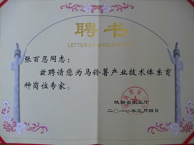 2011年3月4日 我所所長張百忍同志被陜西省農(nóng)業(yè)廳聘請為馬鈴薯產(chǎn)業(yè)技術(shù)體系育種崗位專家。