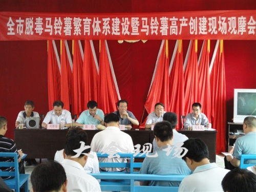 參加完現(xiàn)場(chǎng)觀摩會(huì)后,各參會(huì)人員來(lái)到嵐皋縣東風(fēng)村參加座談會(huì)。市農(nóng)業(yè)局龔局長(zhǎng)介紹了農(nóng)科所脫毒馬鈴薯示范點(diǎn)的成功做法,對(duì)高效、高產(chǎn)、及先進(jìn)的栽培技術(shù)模式給予了高度的評(píng)價(jià),并鼓勵(lì)農(nóng)民種植脫毒馬鈴薯新品種。并希望農(nóng)科所能以此次觀摩會(huì)為契機(jī),進(jìn)一步強(qiáng)化示范基地建設(shè),增強(qiáng)科技含量,提高管理水平,提高種薯質(zhì)量,把馬鈴薯這一產(chǎn)業(yè)做大做強(qiáng)。他指出,各縣、鄉(xiāng)鎮(zhèn)要早安排、早謀劃,充分發(fā)動(dòng)農(nóng)戶,力爭(zhēng)今年全市脫毒馬鈴薯種植面積達(dá)到10萬(wàn)畝以上,為帶動(dòng)安康市乃至陜西省馬鈴薯產(chǎn)業(yè)的持續(xù)發(fā)展奠定基礎(chǔ)。 農(nóng)科所劉繼瑞副所長(zhǎng)在會(huì)上發(fā)表了講話,他介紹了脫毒馬鈴薯種薯生產(chǎn)技術(shù)流程、擴(kuò)繁技術(shù)及示范情況,同時(shí)強(qiáng)調(diào)種植脫毒馬鈴薯要注重抓以下幾點(diǎn):一是抓好品種關(guān),要選擇脫毒的薯種(選擇秦芋30號(hào)、31號(hào)、32號(hào)、安薯56號(hào)、鄂馬鈴薯5號(hào)脫毒種為最佳)。二是抓好播種關(guān),適時(shí)播種,確定馬鈴薯播種適期的重要條件是生育期的溫度。三是抓好管理關(guān),地膜覆蓋,以防風(fēng)保墑保溫。觀摩會(huì)中,嵐皋縣縣委陳穩(wěn)副書記,嵐皋縣東風(fēng)村書記及種植戶代表發(fā)了言,認(rèn)為安康市農(nóng)科所示范點(diǎn)是“提高科技對(duì)提升農(nóng)業(yè)產(chǎn)業(yè)水平、轉(zhuǎn)變發(fā)展方式的引領(lǐng)能力”的一個(gè)很好的示范和佐證。
