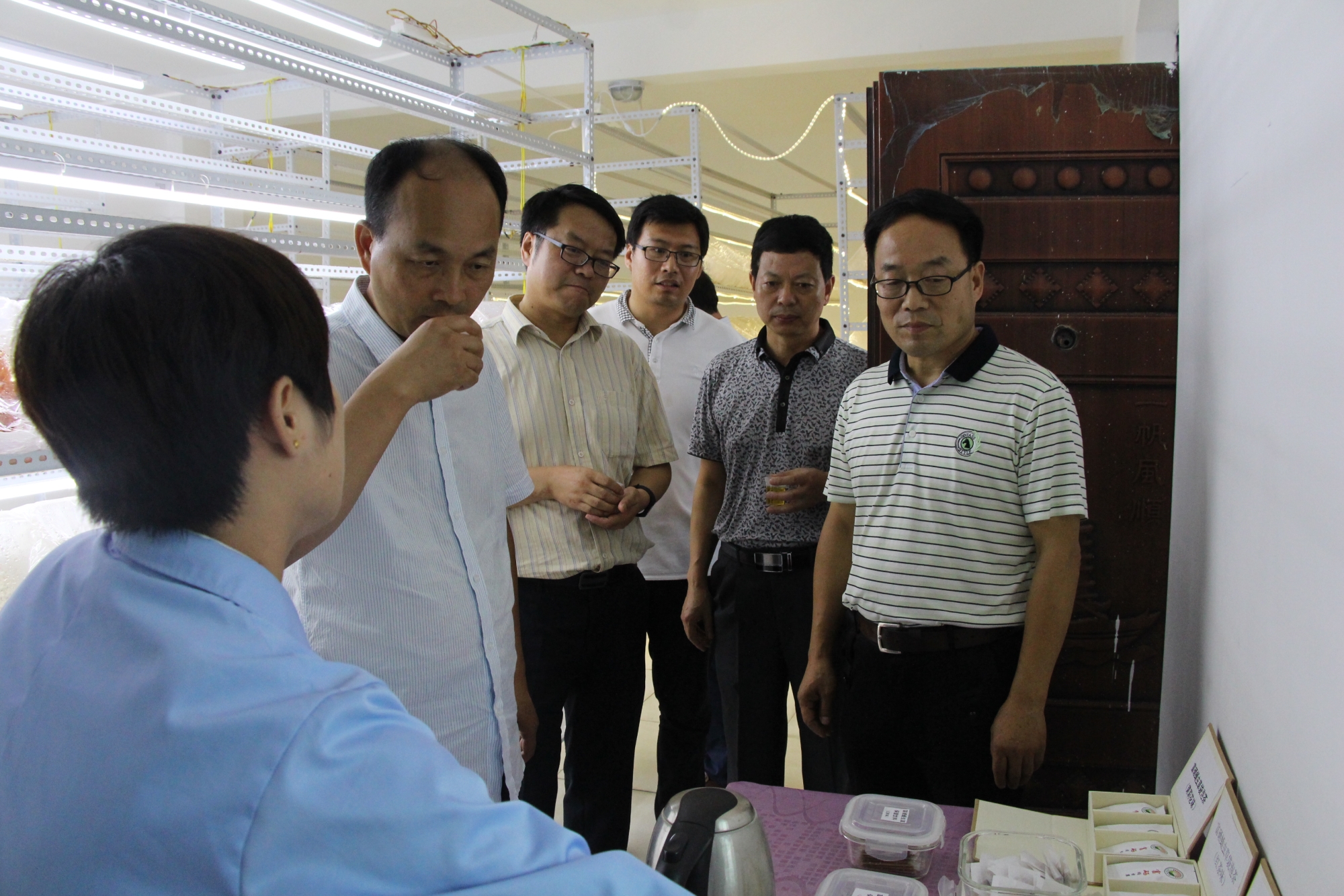 戴建昌一行先后考察了市農(nóng)科所在魔芋、馬鈴薯、番茄、獼猴桃、食用菌、水稻、茶葉等作物方面的研究。在番茄育種大棚,科研人員張文慧向大家介紹了棚內(nèi)種植的不同番茄自交系的特點(diǎn),以及適合陜南地區(qū)的番茄高效高產(chǎn)栽培措施,戴建昌指出,育種是一個(gè)漫長(zhǎng)的過(guò)程,育種人一定要有堅(jiān)定的信念,他提到一個(gè)番茄育種的成功事例,以此鼓勵(lì)科研人員積極進(jìn)取。在食用菌研究中心,科研人員王勇、張園園向大家介紹了食用菌中心近年來(lái)依托農(nóng)科星創(chuàng)天地,加快自身科技成果轉(zhuǎn)化的進(jìn)程,并請(qǐng)考察人員品嘗了新研制開發(fā)的“富硒蛹蟲草袋泡茶”,戴建昌詢問(wèn)了產(chǎn)品的市場(chǎng)前景,鼓勵(lì)科研人員要抓住機(jī)遇,將科研成果投入市場(chǎng)。