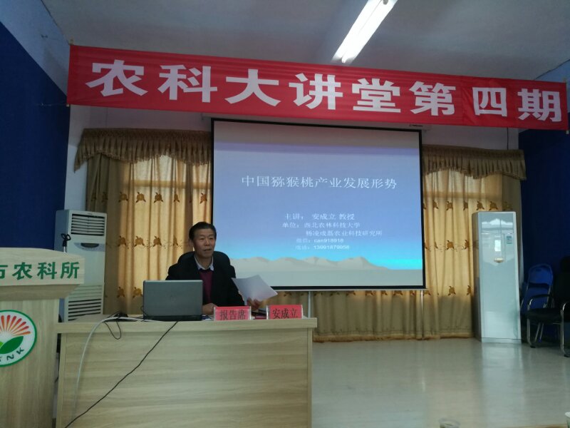 聘任儀式結(jié)束后,安成立教授作了《中國獼猴桃產(chǎn)業(yè)發(fā)展形式》的學(xué)術(shù)報(bào)告,介紹了獼猴桃產(chǎn)業(yè)現(xiàn)狀、存在問題及未來發(fā)展方向,并指出安康是獼猴桃的優(yōu)生地區(qū),具有豐富的種質(zhì)資源,在這里研究選育獼猴桃雄株及授粉配套技術(shù)是十分有利的。部分獼猴桃種植園區(qū)業(yè)主及生產(chǎn)技術(shù)人員參加聘任儀式及學(xué)術(shù)報(bào)告會。
