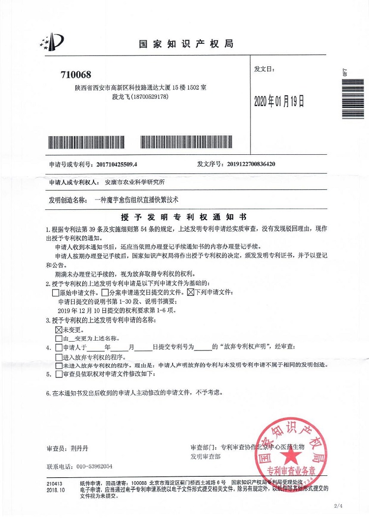 此項(xiàng)發(fā)明利用魔芋愈傷組織,快速生產(chǎn)優(yōu)質(zhì)種芋。該技術(shù)優(yōu)化了傳統(tǒng)魔芋組培快繁技術(shù),提高了生產(chǎn)效率,節(jié)約了生產(chǎn)成本,填補(bǔ)了國內(nèi)在魔芋愈傷組織直播快繁技術(shù)的空白,對于實(shí)現(xiàn)工廠化優(yōu)質(zhì)魔芋種芋繁育具有重要意義。近年來,我院致力于推進(jìn)知識(shí)產(chǎn)權(quán)建設(shè),鼓勵(lì)科研人員進(jìn)行科技研發(fā)和技術(shù)創(chuàng)新,加快科技成果產(chǎn)、學(xué)、研、推、用的協(xié)同轉(zhuǎn)化,助推安康農(nóng)業(yè)的快速發(fā)展。