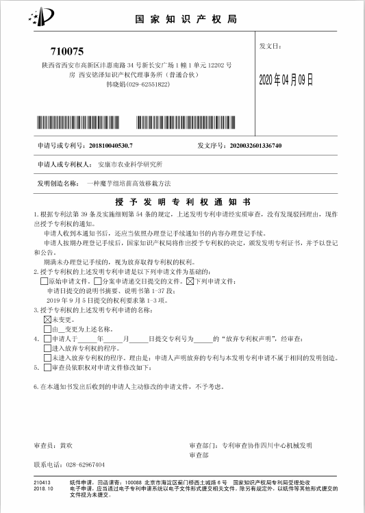 近年來,我院致力于推進(jìn)知識產(chǎn)權(quán)建設(shè),鼓勵科研人員進(jìn)行科技研發(fā)和技術(shù)創(chuàng)新,加快科研成果產(chǎn)學(xué)研推用的協(xié)同轉(zhuǎn)化,助力安康魔芋產(chǎn)業(yè)的快速發(fā)展。