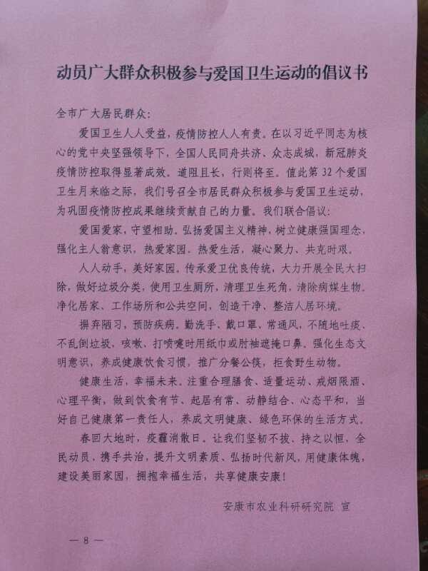 按照市農(nóng)業(yè)農(nóng)村局志愿服務(wù)活動(dòng)的總體部署。為切實(shí)做好愛國衛(wèi)生活動(dòng)及全面打贏新冠肺炎疫情阻擊戰(zhàn)工作。我院組織5名志愿服務(wù)隊(duì)員在漢濱區(qū)新城街道辦木竹橋村宣傳發(fā)放愛國衛(wèi)生運(yùn)動(dòng)倡議書。同時(shí),對(duì)該村主干道路兩側(cè)人行道、綠化帶衛(wèi)生死角等地方進(jìn)行了集中清掃,切實(shí)為疫情防控工作“保駕護(hù)航”。