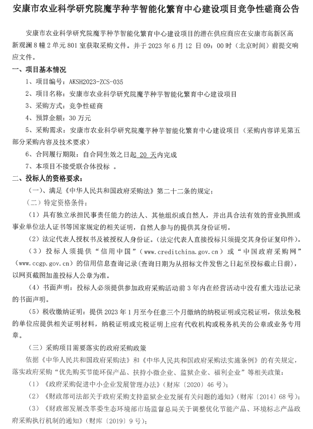 安康市農(nóng)業(yè)科學研究院魔芋種芋智能化繁育中心建設(shè)項目競爭性磋商公告