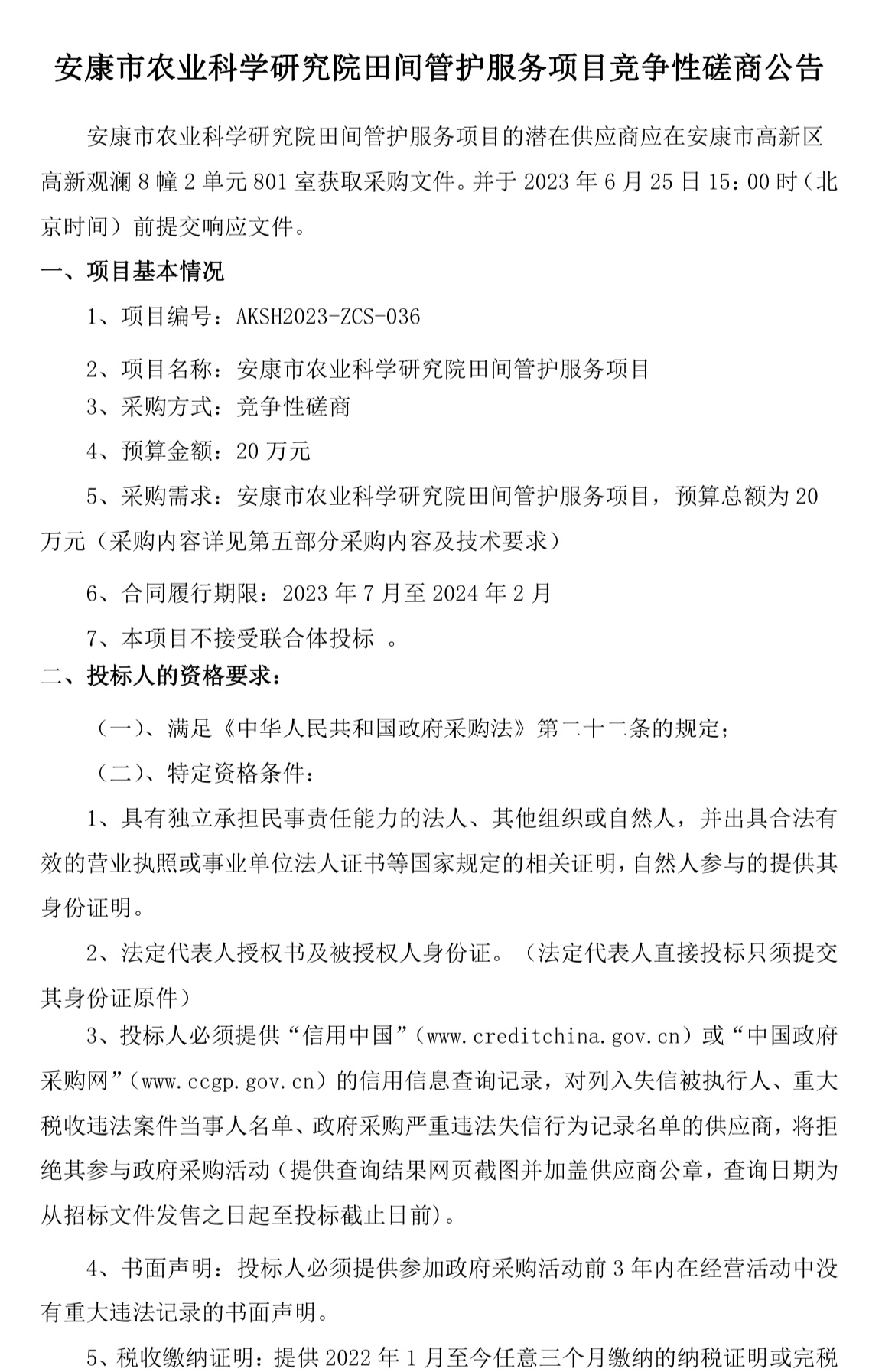 安康市農(nóng)業(yè)科學(xué)研究院田間管護(hù)服務(wù)項(xiàng)目競(jìng)爭(zhēng)性磋商公告