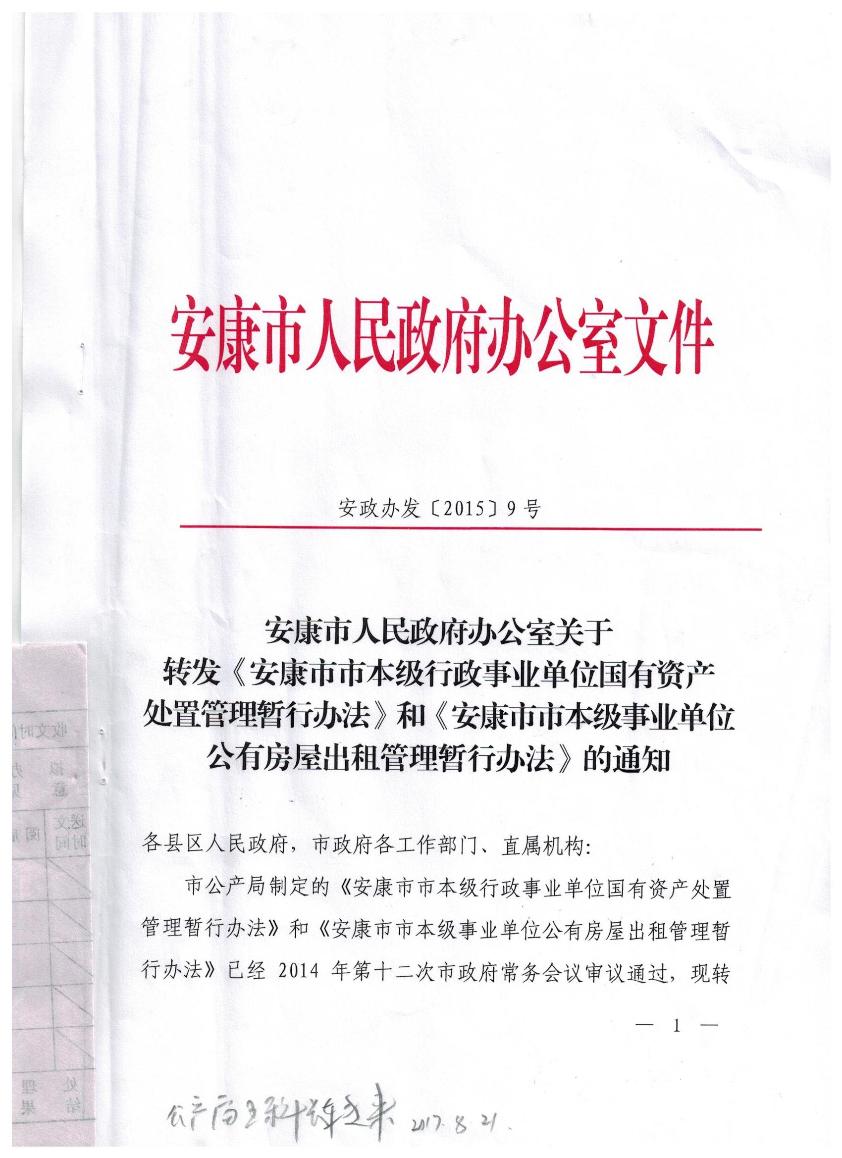 安康市人民政府辦公室關(guān)于轉(zhuǎn)發(fā)《安康市市本級行政事業(yè)單位國有資產(chǎn)處理管理暫行辦法》和《安康市市本級事業(yè)單位公有房屋出租管理暫行辦法》的通知